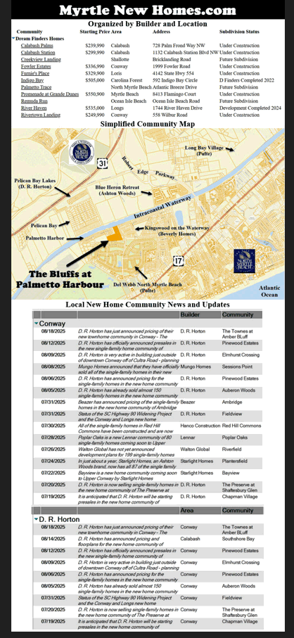 Certainly a prospective Myrtle Beach new home owner can go directly to the builder site to see the new home communities currently being offered by that builder, i.e. D. R. Horton new home communities. https://www.drhorton.com/. However, a prospective Myrtle Beach new home owner might want to also know what new home communities the builder has recently completed in the Myrtle Beach AND what new home communities the builder is planning for the future in the Myrtle Beach area. New Homes Myrtle Beach is literally the only one stop shopping resource that can provide all of this Myrtle Beach new home community is one simple location. Case in point, Myrtle Beach New Home Communities by D. R. Horton.
