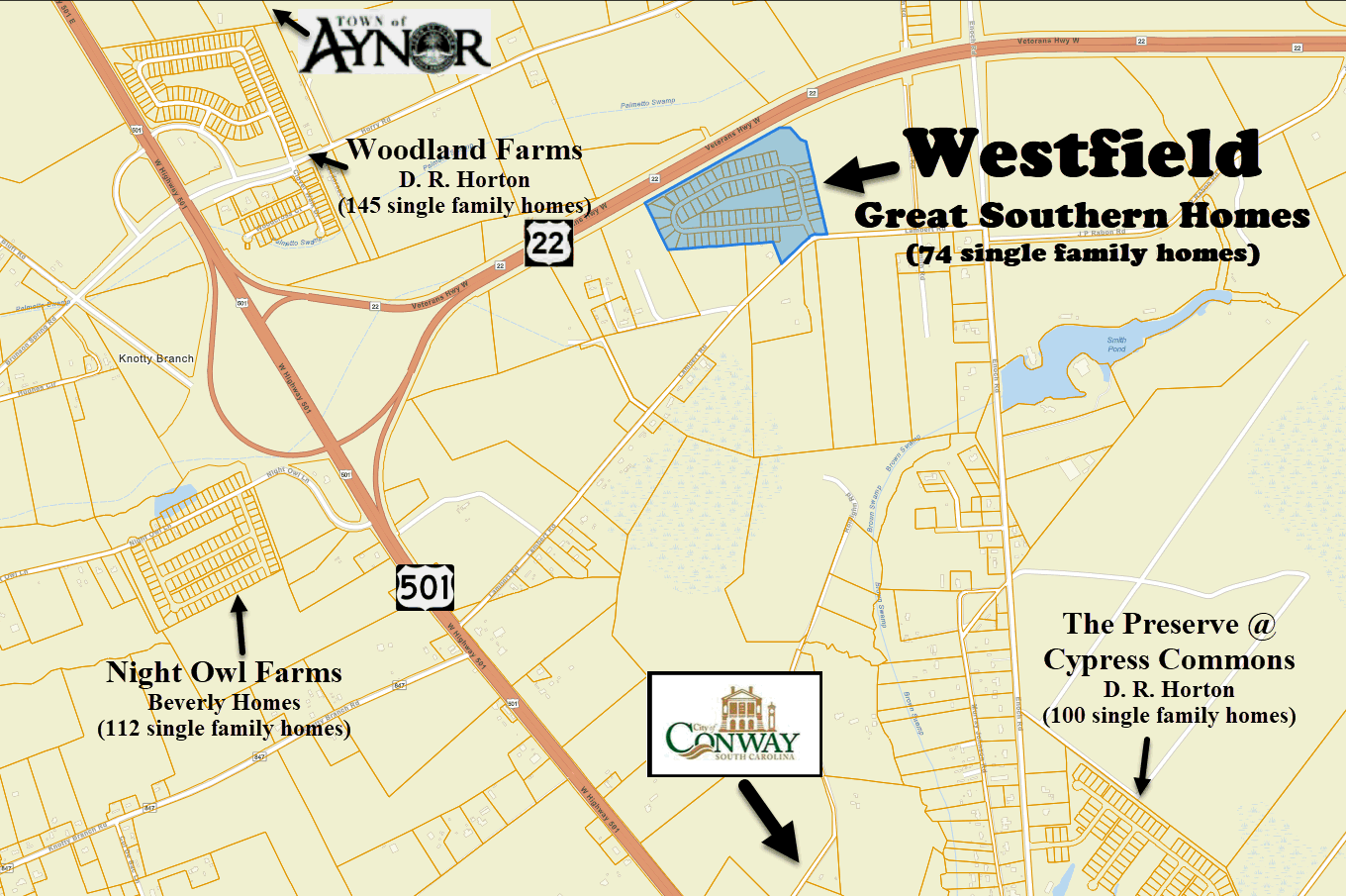 Land development and the construction of the models and spec homes is well underway in Westfield. The location of this new home community in Conway is very conveniently located close to the intersection of Highway 501 and Highway 22.