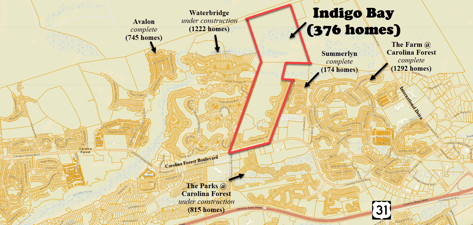 Horry County has approved the development of 376 single family homes, 173 single family homes have been developed, and an additional 203 single family homes remain to be developed in the Carolina Forest new home community of Indigo Bay.
